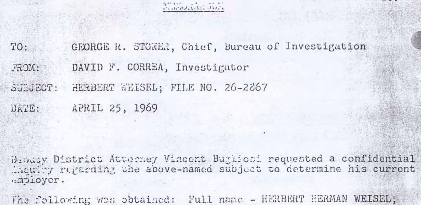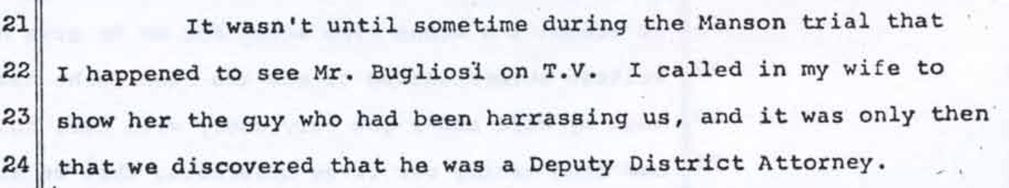 The darkest secrets in Bugliosi’s past had not only surfaced already; they had nearly destroyed his career, before somehow being forgotten again. As reported by the Los Angeles papers, Bugliosi had stalked and anonymously threatened his former milkman through much of the late Sixties, even apparently using DA investigators to acquire personal information on him.