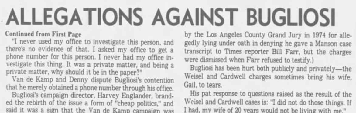 “I later knew how crazy [Bugliosi] was,” said O’Neill. “I mean everybody, it was kind of unanimous in the DA's office, said, oh yeah, Vince had screws loose.” This was no exaggeration. Journalist Mary Neiswender warned O’Neill that, when writing an exposé on Bugliosi in the Eighties for the Long Beach Press Telegram and Independent, Bugliosi had intimated he knew “where her kids went to school, ‘and it would be very easy to plant narcotics in their lockers,’” while Bugliosi himself told O’Neill “that he had no compunction about hurting people to ‘exact justice or get revenge.’”