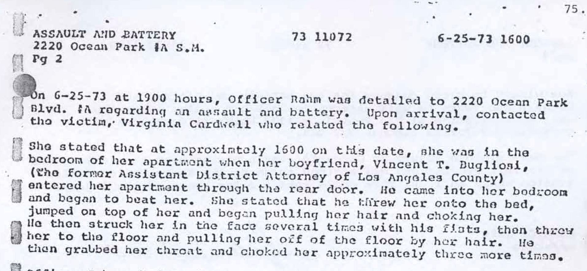 In 1973, a Santa Monica woman named Virginia Cardwell reported to the police that she had been beaten by her married lover. Vincent Bugliosi, she said, had threatened to kill her if the newly-pregnant Cardwell didn’t abort their love child. Refusing, Cardwell was physically attacked by Bugliosi, battered so badly she filed a police report. “He’d beat the hell out of his mistress,” said O’Neill, “and even worse this time, not only lied to the media about it, but he lied to the police about what it really happened.”